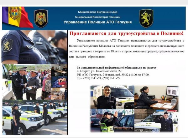 Управлением полиции АТО Гагаузия приглашаются на трудоустройство в Полицию РМ на должность младшего и среднего начальствующего состава граждан в возрасте 18 лет и старше, имеющие среднее, среднетехническое или высшее образование.