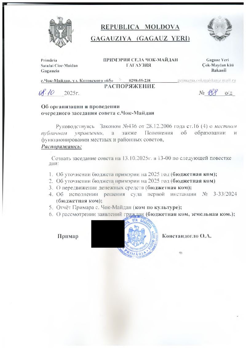 13 октября 2025 года в 13:00 часов в зале заседаний с.Чок-Майдан проведется внеочередное заседание совета по следующей повестке дня: